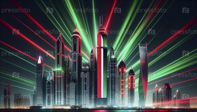 Флаг ОАЭ в современной архитектуре горизонта, Ai generated image