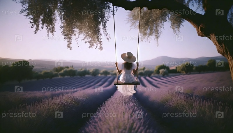 Ребенок, качающийся в солнечном поле лаванды, Ai generated image