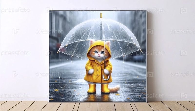 Котенок в дождевом пальто под плакатом зонтика, Ai generated image