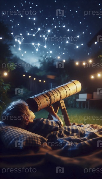 Мальчик смотрит на звезды через гигантский картонный телескоп, Ai generated image