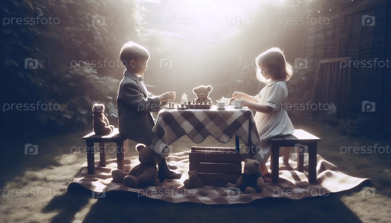 Очаровательный плакат чайной вечеринки с плюшевым медведем на заднем дворе, Ai generated image