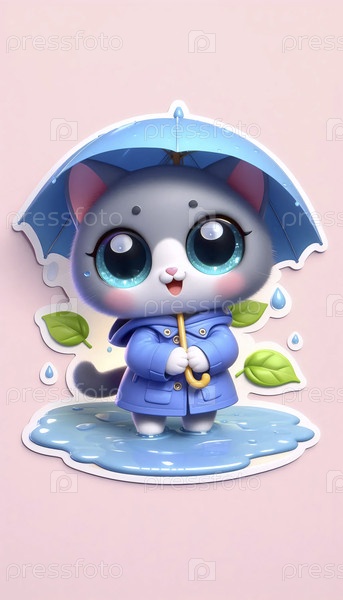 3D милая кошка под зонтиком наклейка, Ai generated image