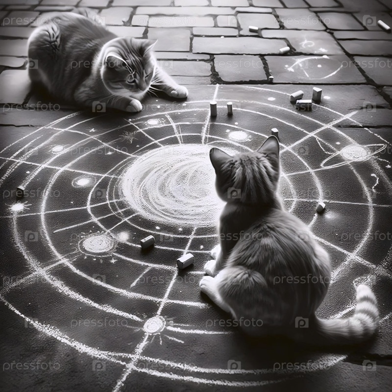 A cat observing a child's earnest sidewalk chalk universe, Ai generated image Кошка наблюдает за ребенком на тротуаре