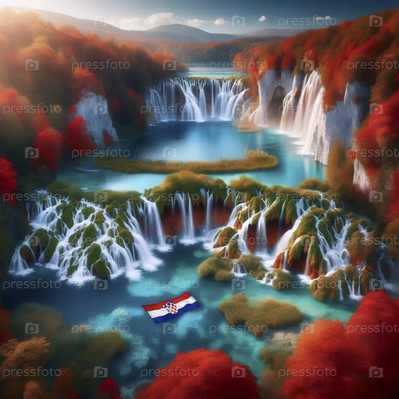 Хорватский флаг в водах Плитвицких озер, Ai generated image