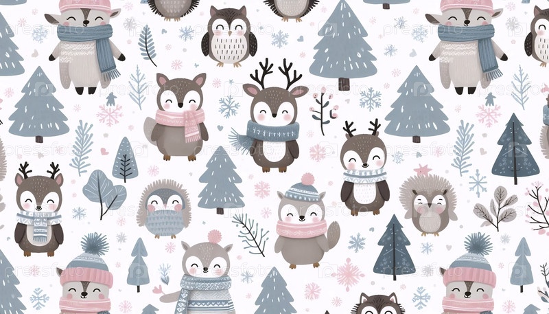 Милые скандинавские зимние животные Бесшовный рисунок, Ai generated image