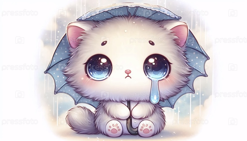 Кавайский кот с зонтиком, но все еще грустный наклейка, Ai generated image