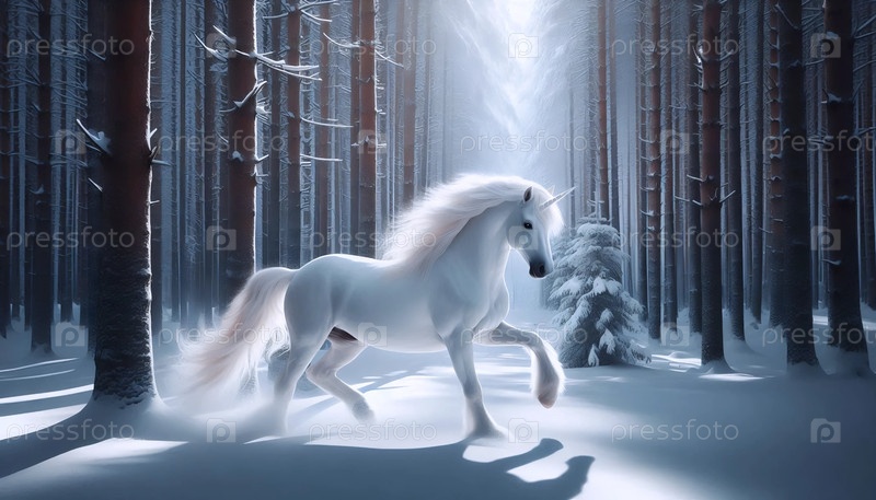 Единорог в снежном лесу, Ai generated image