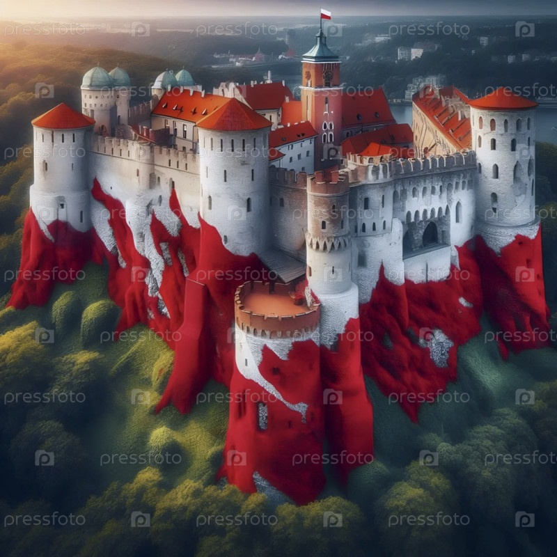 Польский флаг в исторической архитектуре замка, Ai generated image