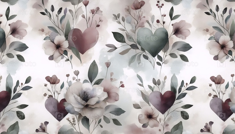 Водяной акварель кровоточащие сердца цветочный бесшовный рисунок, Ai generated image