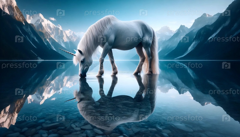 Единорог в озере с отражением, Ai generated image