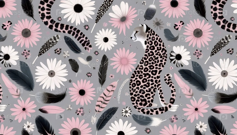 Leopard Daisies pattern Grey A Pink Leopard Feathers, Ai generated image Образцы романов о леопардах в сером и розовом цветах