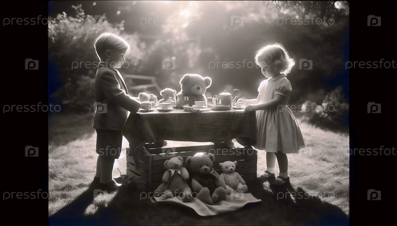 Очаровательный плакат чайной вечеринки с плюшевым медведем на заднем дворе, Ai generated image