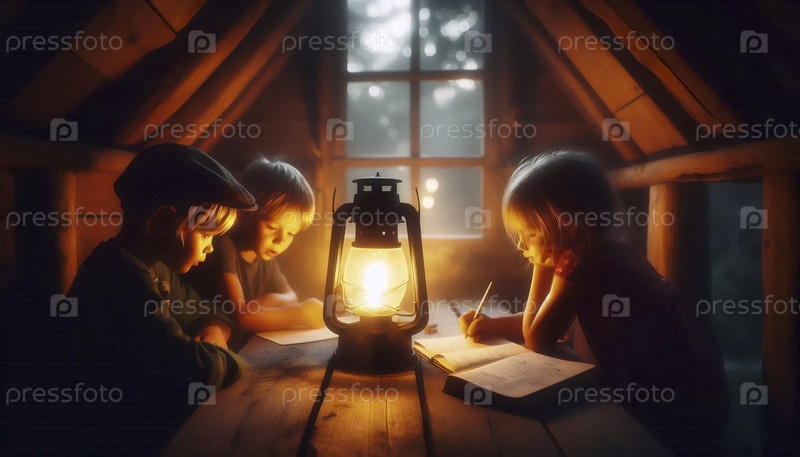 Секретная встреча на дереве в сумерках при свете фонаря, Ai generated image