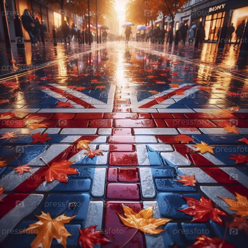 Флаг Союза в Лондоне отражается на дождливой тротуаре, Ai generated image