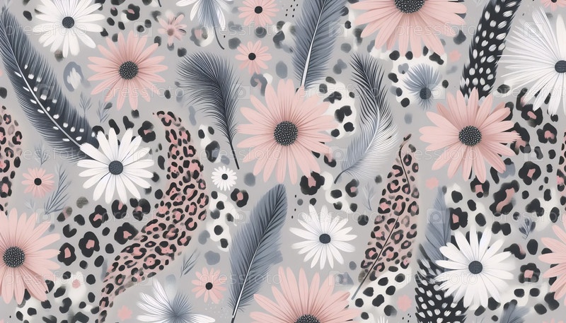 Leopard Daisies pattern Grey A Pink Leopard Feathers, Ai generated image Образцы романов о леопардах в сером и розовом цветах
