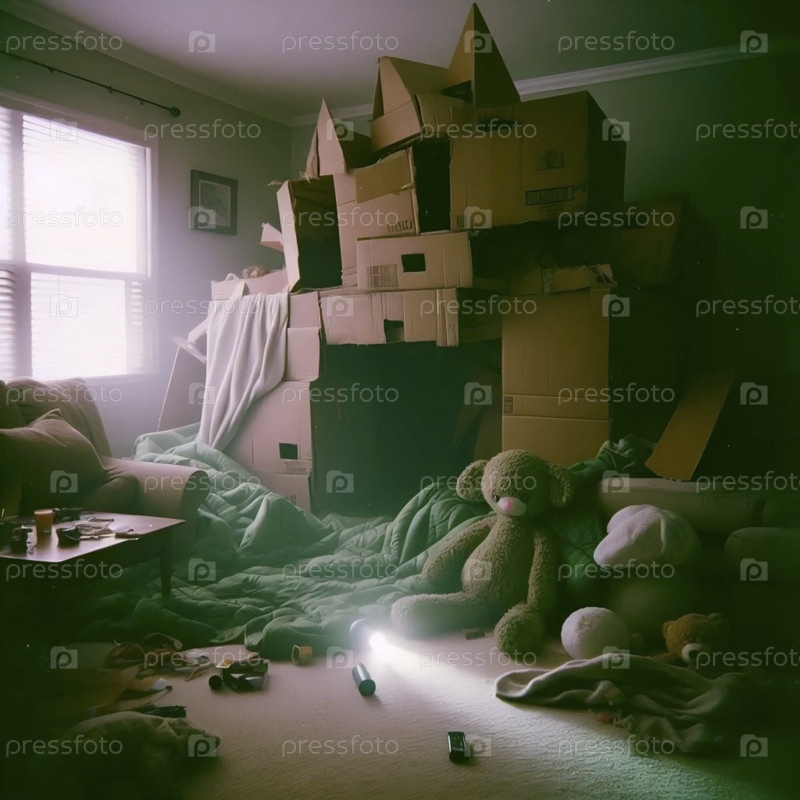 Развалившийся форт одеяла в пустой комнате, Ai generated image