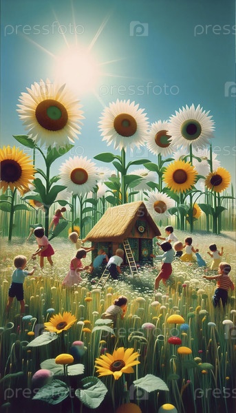 Группа детей строит фантастический цветочный домик, Ai generated image