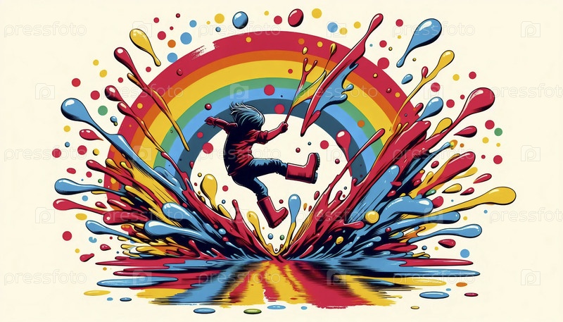 Радостный брызг в гигантском радужном луже, Ai generated image