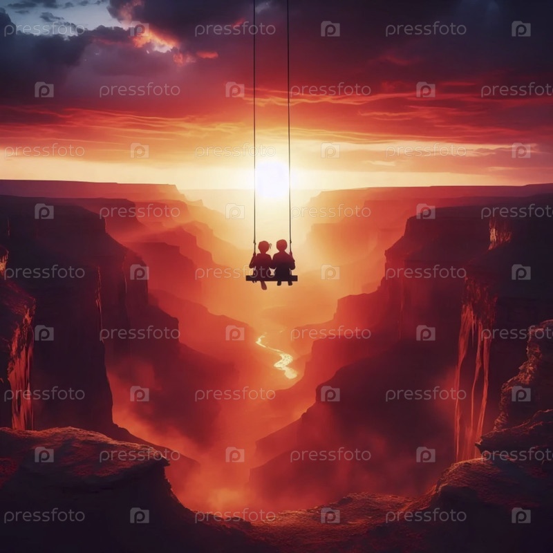 Два ребенка на колесной качели над каньоном при закате, Ai generated image