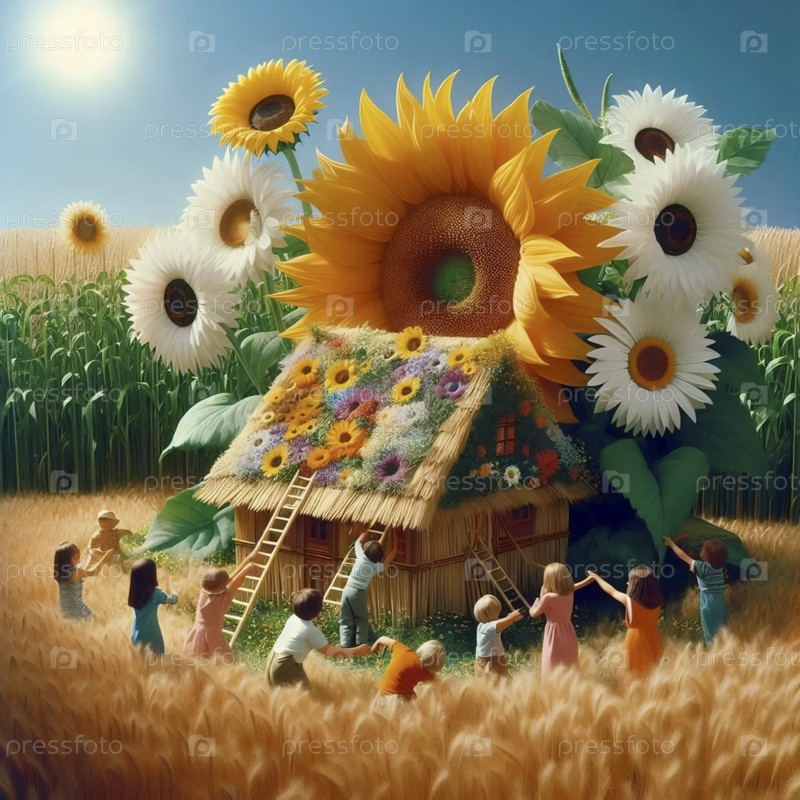 Группа детей строит фантастический цветочный домик, Ai generated image