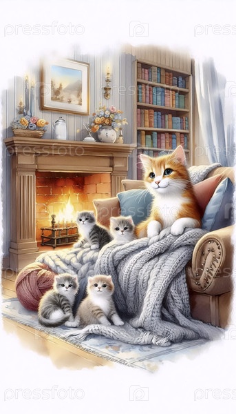 Семья кошек в уютном доме Иллюстрация, Ai generated image