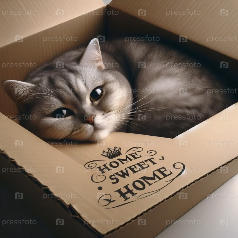 Уютный кот в картонной коробке наклейки, Ai generated image