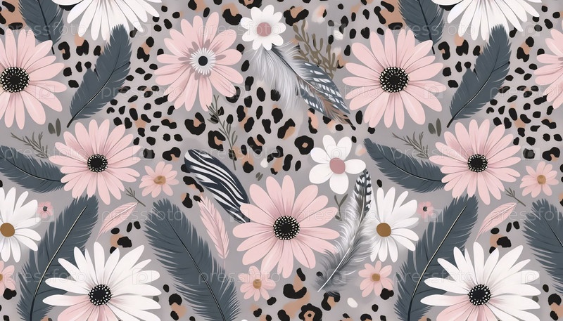 Leopard Daisies pattern Grey A Pink Leopard Feathers, Ai generated image Образцы романов о леопардах в сером и розовом цветах