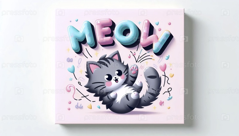 Играющаяся кошка с Мяу Типографическая художественная печать, Ai generated image