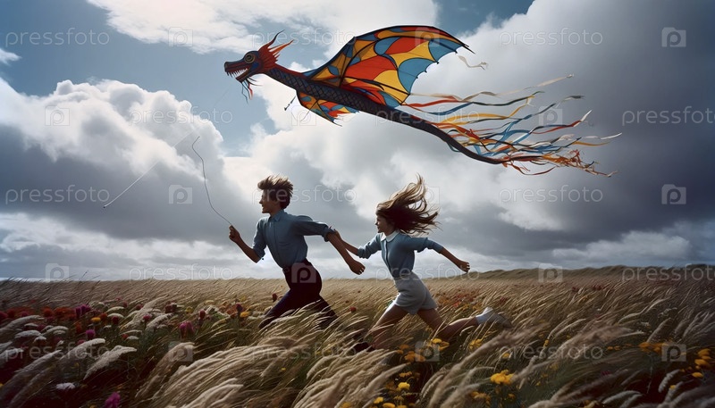Мальчик и девочка запускают яркого драконьего воздушного змея на прибрежном лугу, Ai generated image
