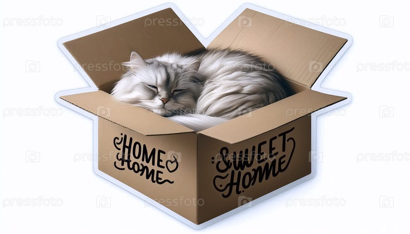 Уютный кот в картонной коробке наклейки, Ai generated image