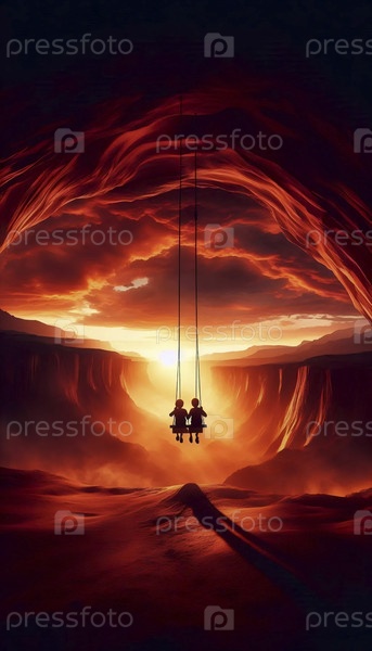 Два ребенка на колесной качели над каньоном при закате, Ai generated image