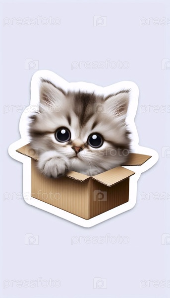 Котенок, скрывающийся в коробке со стикером peek-a-boo, Ai generated image