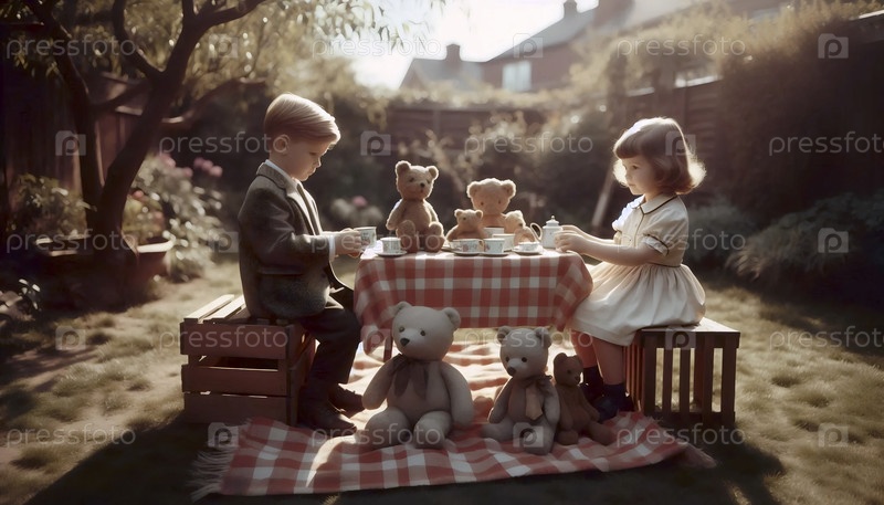 Очаровательный плакат чайной вечеринки с плюшевым медведем на заднем дворе, Ai generated image