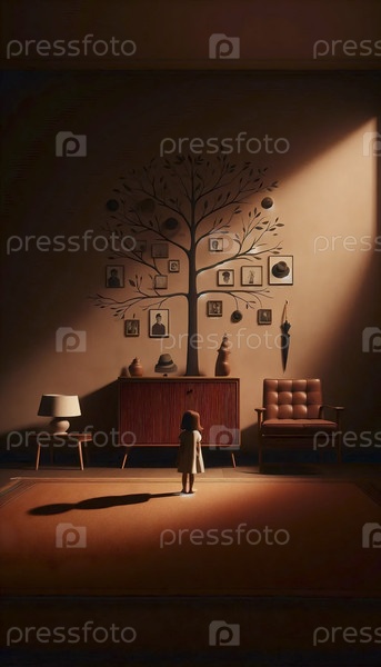 Ребенок смотрит на стилизованную стену семейного дерева, Ai generated image