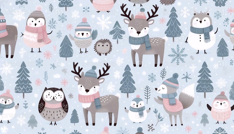 Милые скандинавские зимние животные Бесшовный рисунок, Ai generated image