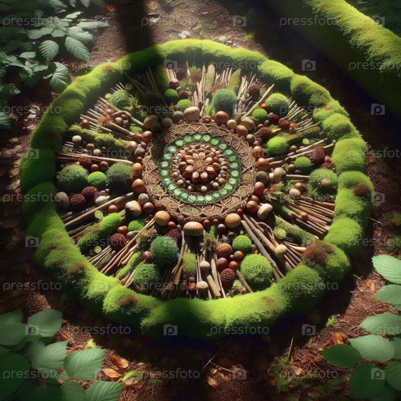 Лесная мандала из ветвей и мха, Ai generated image