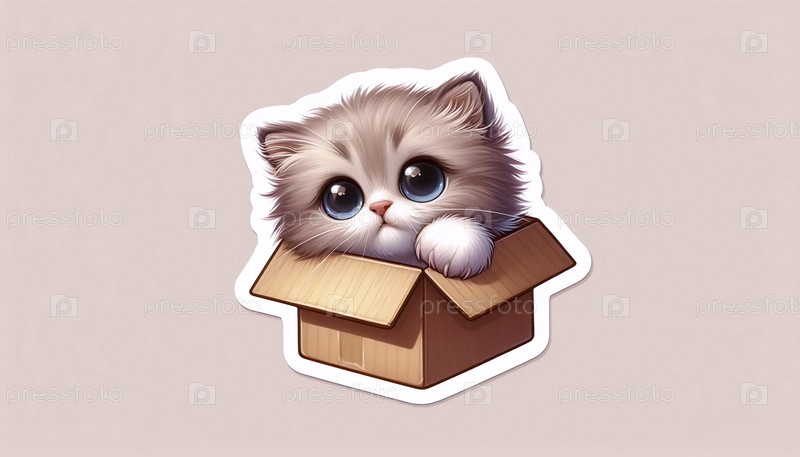 Котенок, скрывающийся в коробке со стикером peek-a-boo, Ai generated image