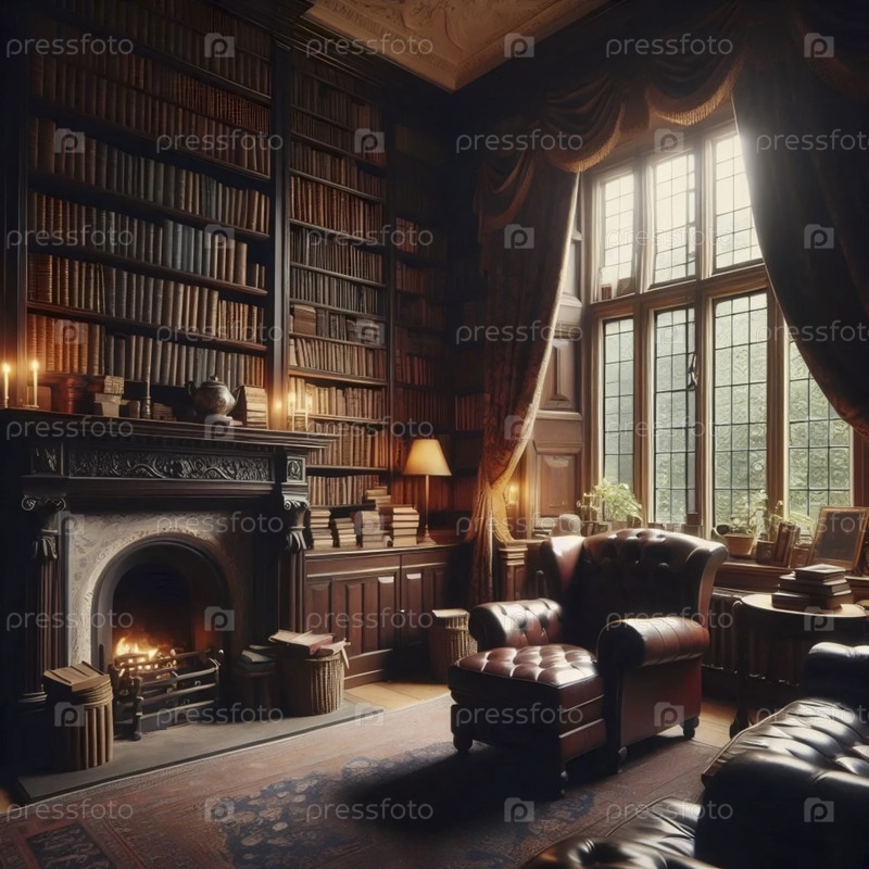 Классический интерьер английской коттеджной библиотеки, Ai generated image