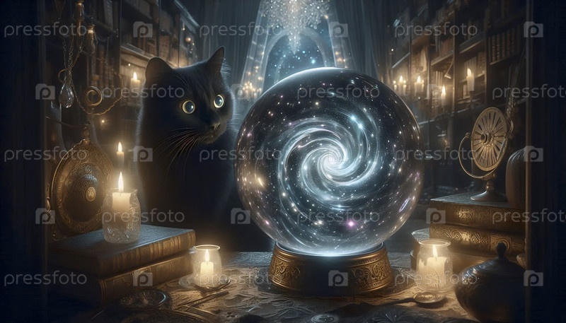Мистический кот со светящимся плакатом кристаллического шара, Ai generated image