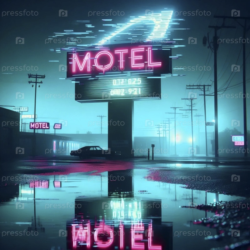 Блестящий неоновый мотель отражается в луже, Ai generated image