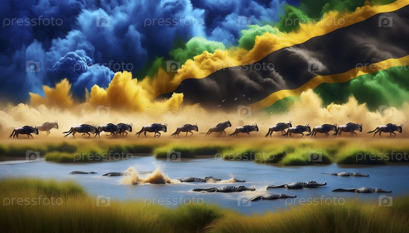Флаг Танзании в Серенгети great migration river crossing, Ai generated image A (Айский язык)