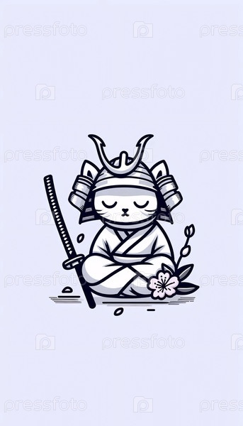 Минималистское линейное искусство медитирующего самурайского кота, Ai generated image