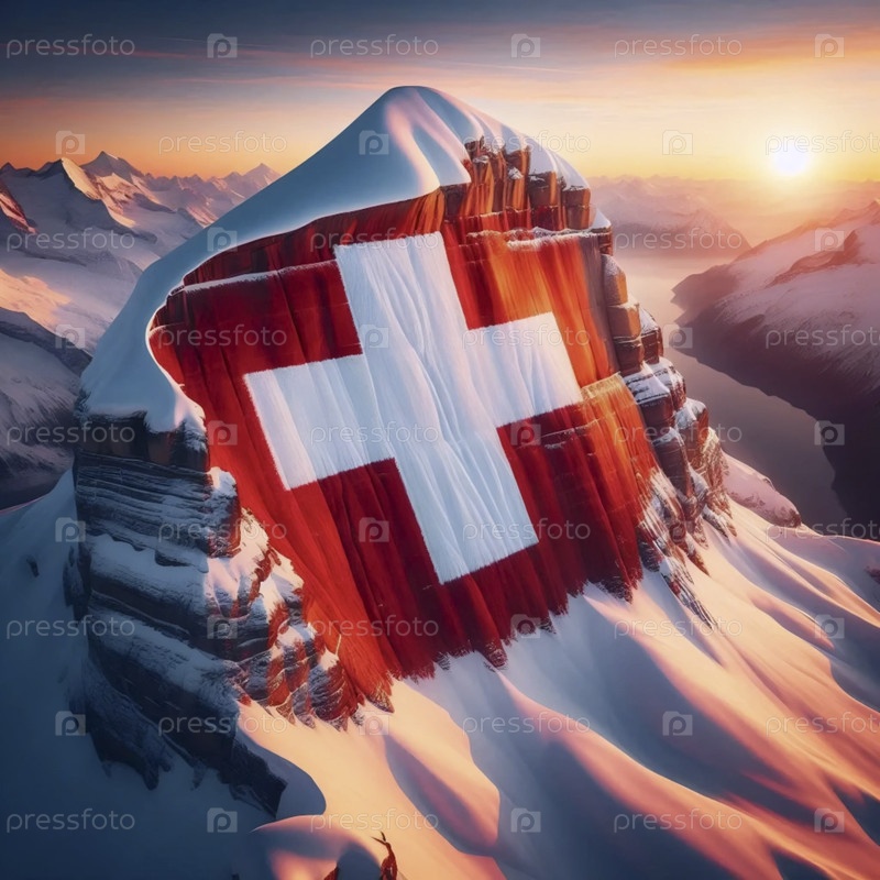 Швейцарский флаг на вершине альпийской горы, Ai generated image