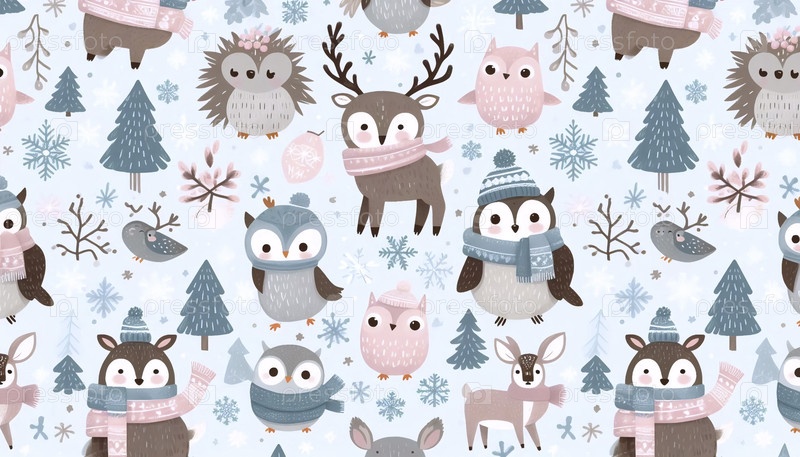 Милые скандинавские зимние животные Бесшовный рисунок, Ai generated image