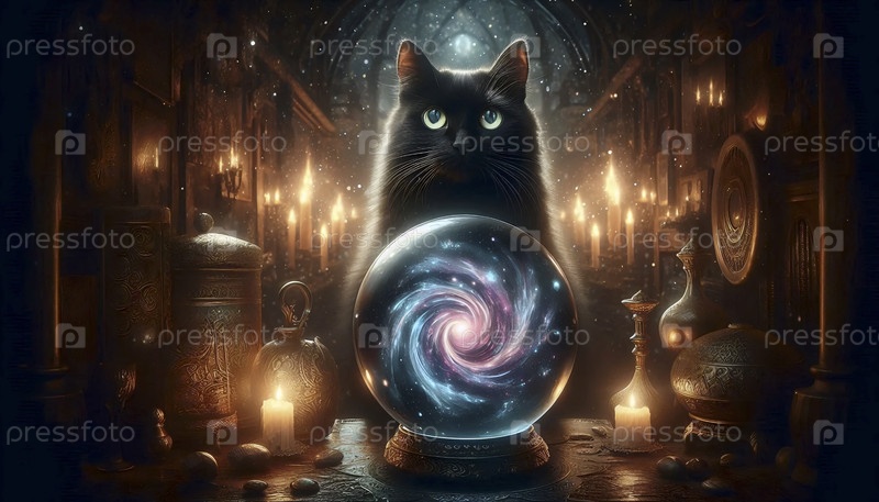 Мистический кот со светящимся плакатом кристаллического шара, Ai generated image