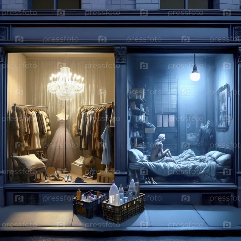 Отражение бедной комнаты в витрине магазина ночью, Ай создал изображение