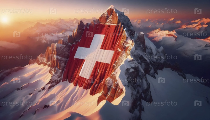 Швейцарский флаг на вершине альпийской горы, Ai generated image