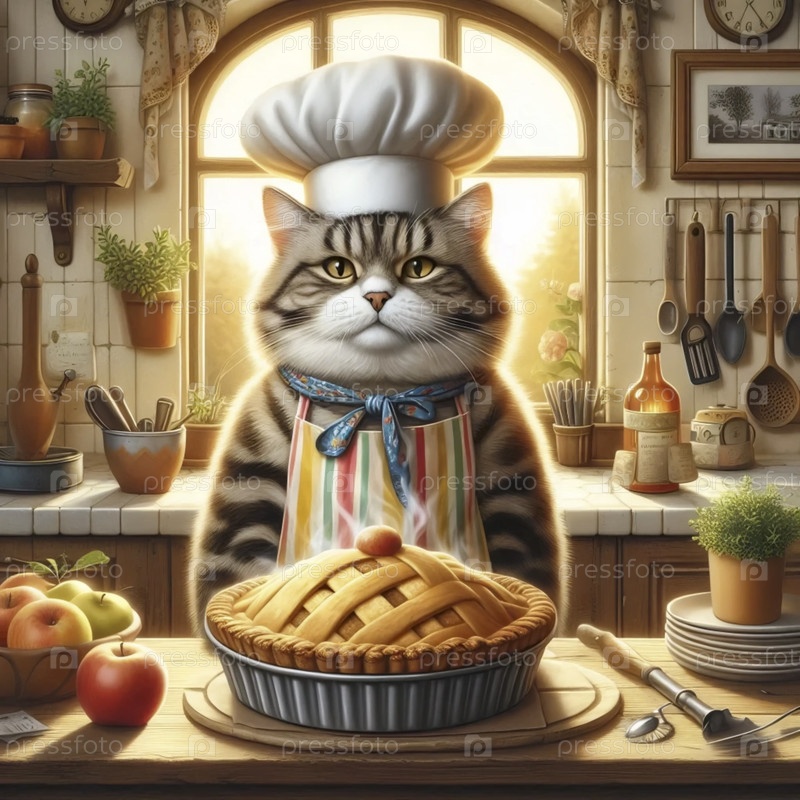 Повар-кошка с кухонным художественным принтом пирога, Ai generated image
