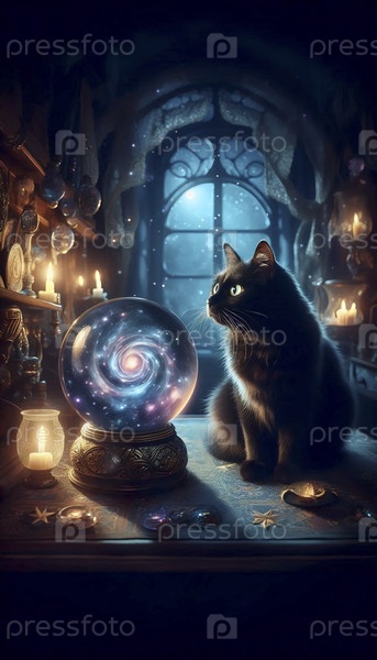 Мистический кот со светящимся плакатом кристаллического шара, Ai generated image