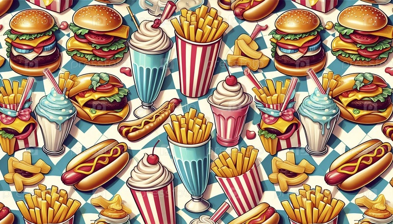 Бесшовный рисунок ретро-обеденной еды, Ai generated image